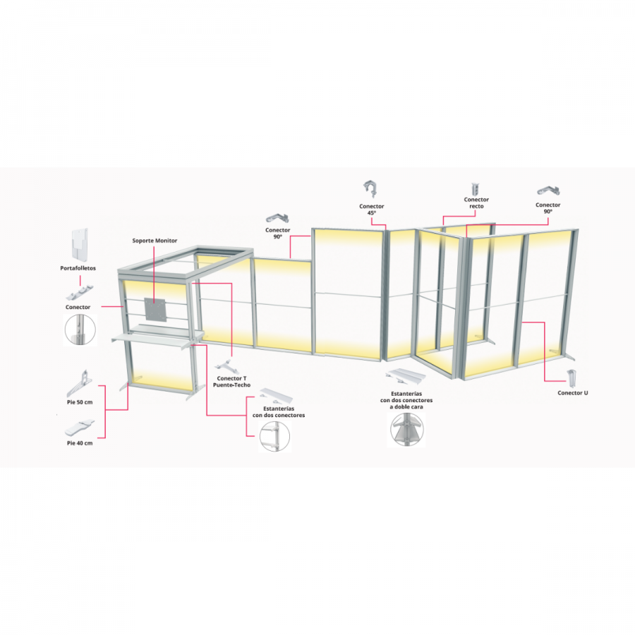 Estos elementos permiten integrar pantallas, expositores de documentos o baldas para producto, todo sobre la propia estructura modular.